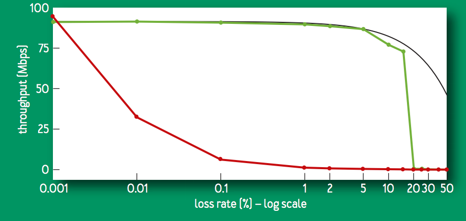 この大幅なスループットの改善は,BBR が loss-based ではないことが直接的に影響している.次の図は,100 [Mbps], 100 [ms] のリンクで,60秒間のフローに対するランダムパケットロス率と goodput (送信者から受信者に正常に伝送された実際のデータ量を示す計測値) の関係の比較である.CUBIC (赤色) は,0.1% の損失でスループットが 1/10 になってしまう一方,BBR (緑色) は 15% の損失までは 95% のスループットを維持する.