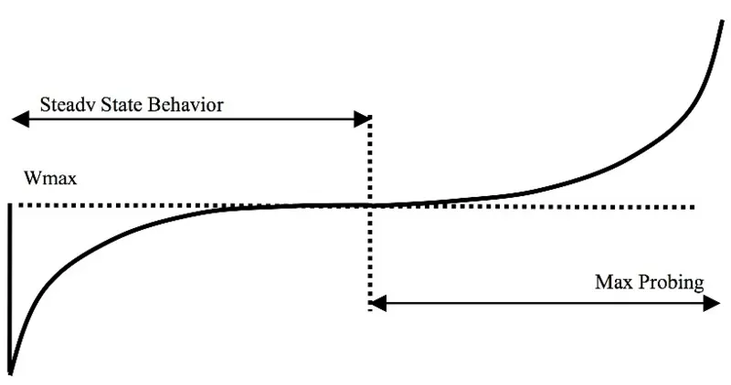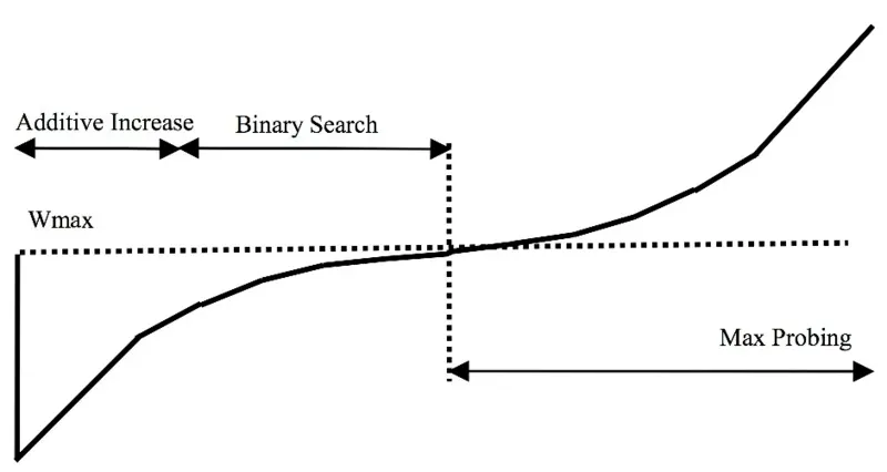 BIC-TCP (Binary Increase Congestion Control) は,パケットロスの発生を平衡点とみなし,次の平衡点を探索するように動作する.パケットロス時点での cwnd を Wmax として記憶し,cwnd を減少させる.その後線形に増加させた (Additive Increase) 後,指数的に増加させる (Binary Search).平衡点以降も,パケットロスが発生させるまでは cwnd を増加させる (Max Probing).BIC-TCP ウインドウ増加関数の図を以下に示す.
